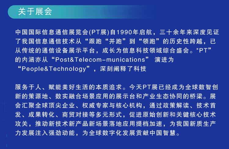 中国国际信息通信展览会(PT展)自1990年启航,三十余年来深度见证了我国信息通信技术从“跟跑”“并跑”到“领跑”的历史性跨越,已从传统的通信设备展示平台,成长为信息科技领域综合盛会。“PT” 的内涵亦从“Post&Telecom-munications” 演进为“People&Technology",深刻阐释了科技服务于人、赋能美好生活的本质追求。今天PT展已经成为全球数智创新的策源地、数实融合场景应用的展示台和产业生态协同的桥梁。展会汇聚全球顶尖企业、权威专家与核心机构,通过政策解读、技术首发、成果转化、商贸对接等多元形式促进原始创新和关键核心技术攻关,推动新技术新产品新场景落地应用提档加速,为我国新质生产力发展注入强劲动能,为全球数字化发展贡献中国智慧。